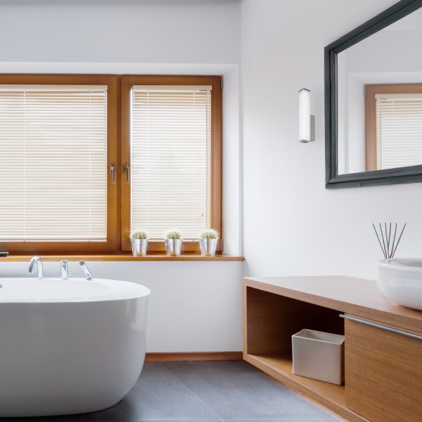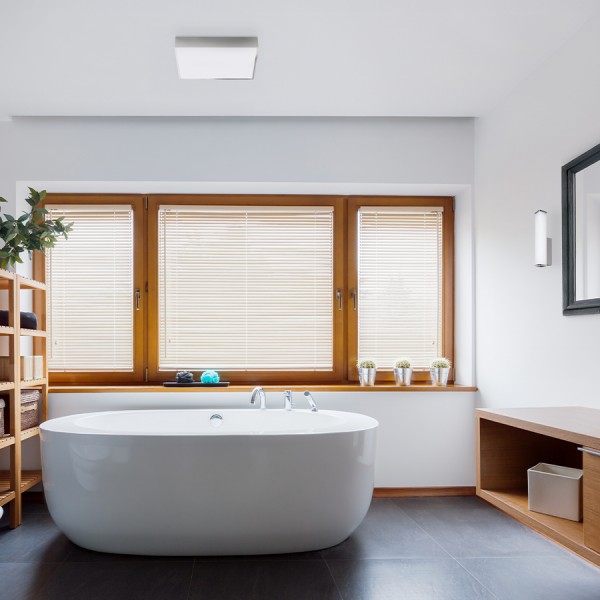 Cilindrična stenska svetilka z vgrajeno LED in senčnikom opalne barve na kromiranem podstavku. Primerno za vlažna okolja.