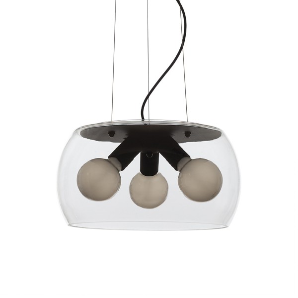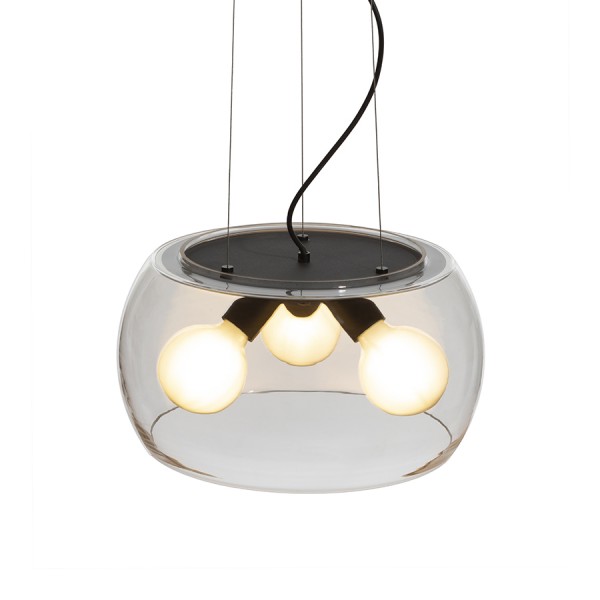 Steklena viseča svetilka v več barvnih različicah stekla, za tri LED žarnice baze E27. Črn lak viseči set z žicami iz nerjavečega jekla in PVC kablom. Majhni mehurčki v steklu so posledica proizvodnega procesa, ne gre za napako.