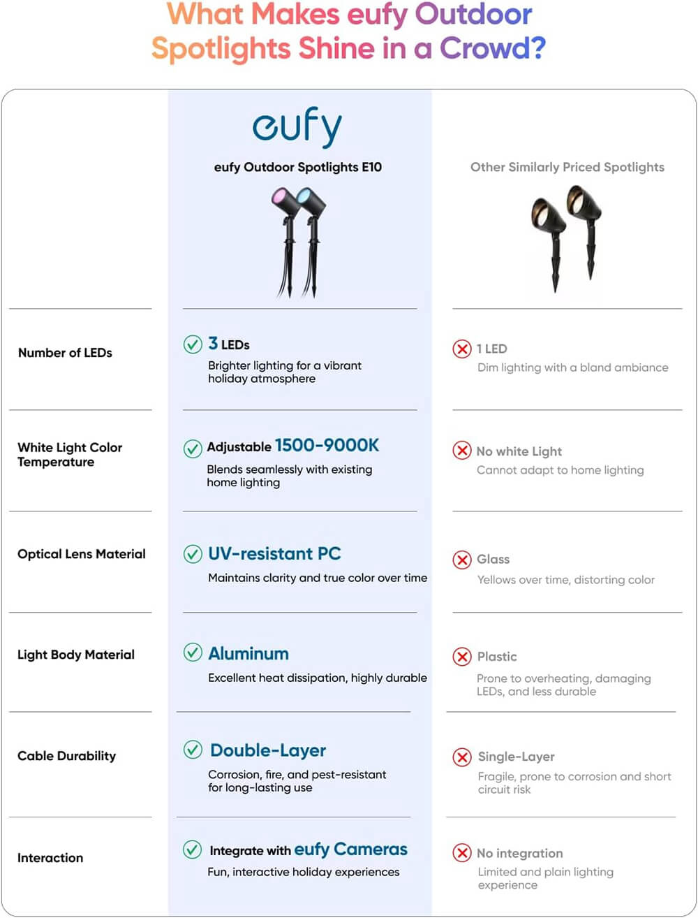 Brezhibna integracija z eufy kamerami: Reflektorje lahko sinhronizirate z eufy kamerami, da se ob zaznavi gibanja samodejno sprožijo svetlobni učinki – kot dobrodošlica, varnostni ukrep ali personalizirana osvetlitev, ki poveča varnost in ustvari prijetno vzdušje v skupnosti.