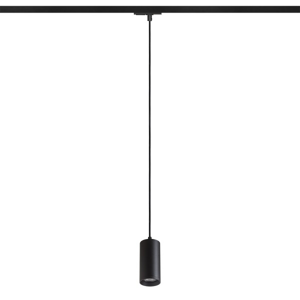 Minimalističen cilindrični obesek za svetlobne vire GU10 na okroglem podstavku. Vzmeti, pritrjene na okov, omogočajo uporabo svetlobnih virov različnih dolžin. Kabel je pritrjen na adapter za 1-krožne tire.