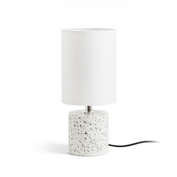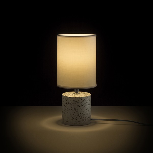 Minimalistična namizna svetilka cilindrične oblike s tekstilnim senčnikom in unikatnim izgledom.