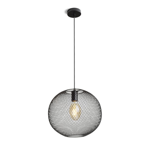 Viseča svetilka v obliki krogle iz fine žične mreže, primerna za okrasno LED žarnico z grlom E27. Največji možen premer svetlobnega vira znaša 9,5 cm.
