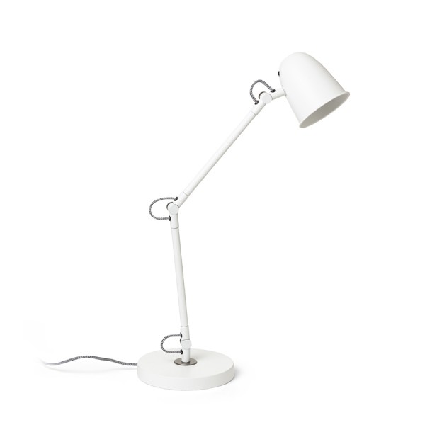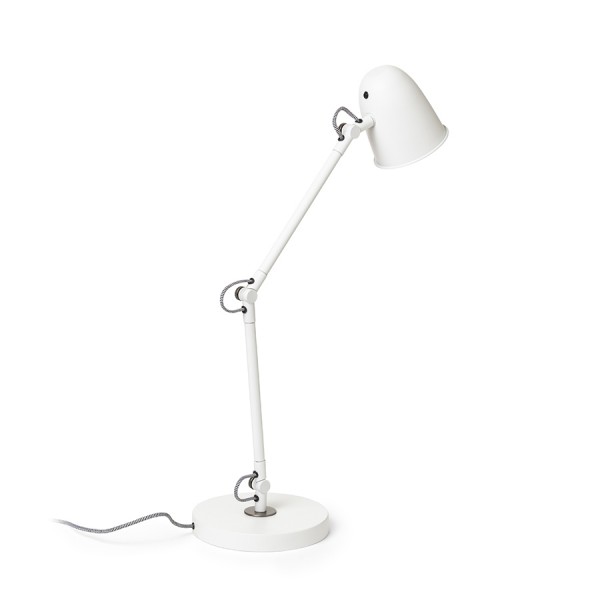 Namizna svetilka z dvozgibnim krakom za LED vire z okovjem E14. Stikalo se nahaja na zadnji strani senčila.