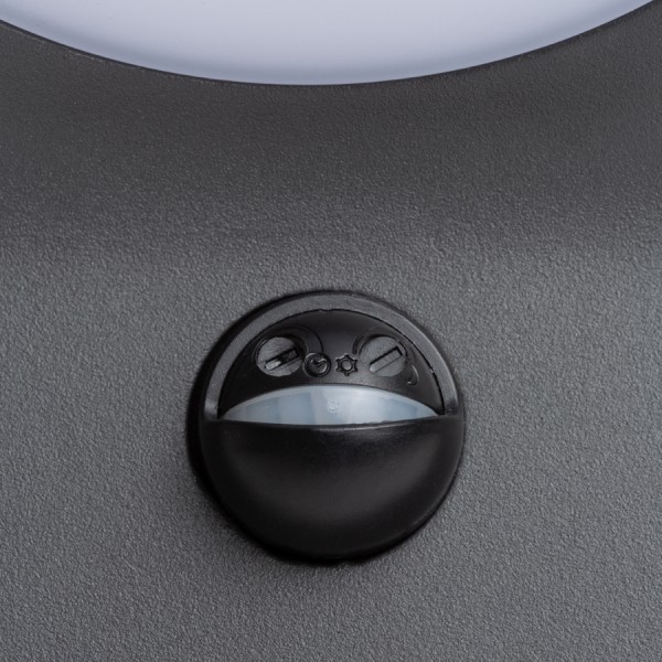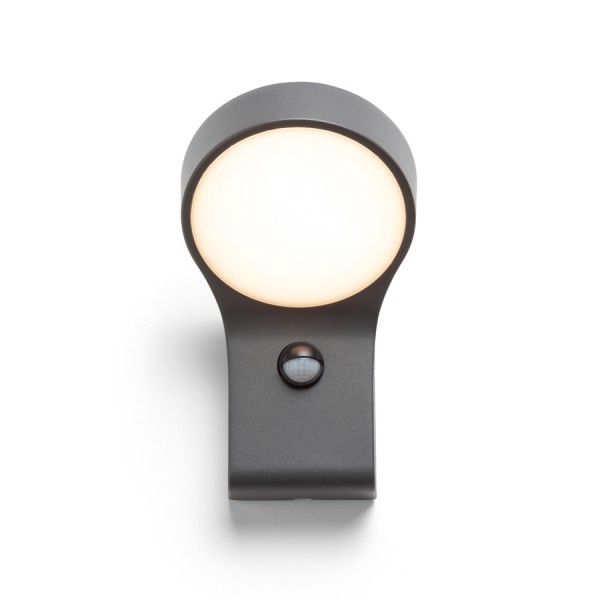 Zunanja stenska svetilka iz masivnega aluminija z vgrajeno LED diodo in opalnim razpršilcem iz serije ELIA. Vključuje nastavljiv senzor gibanja.