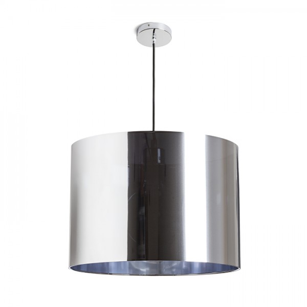 Okrasna viseča svetilka s kromiranim senčnikom.Površina senčnika je deloma transparentna, ko je svetilka prižgana in zrcalna, ko je svetilka ugasnjena.