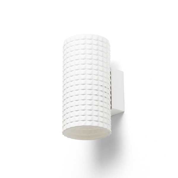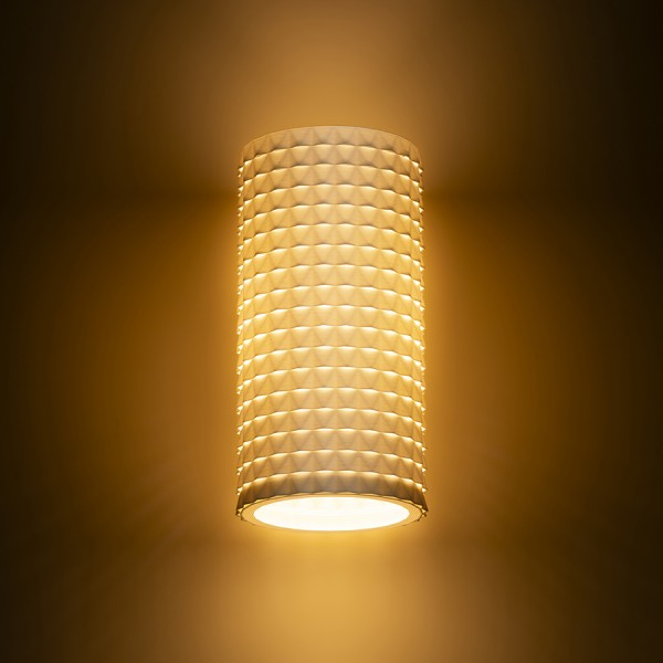 Stenska svetilka, ustvarjena s 3D tiskanjem. Senčilo je izdelano iz okolju prijaznega PLA materiala, ki je popolnoma razgradljiv.