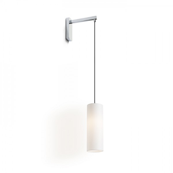 Stenska svetilka s kromirano osnovo, navpičnim kablom in valjastim tekstilnim senčnikom.