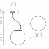 Viseča ekscentrična svetilka s senčnikom iz triplex opal stekla. Kabel za obešanje je ločen od električnega kabla. Transparenten kabel in kromirano okrasje.