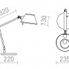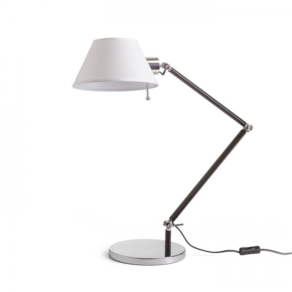 Namizna svetilka z gibljivo roko in tekstilnim senčnikom.