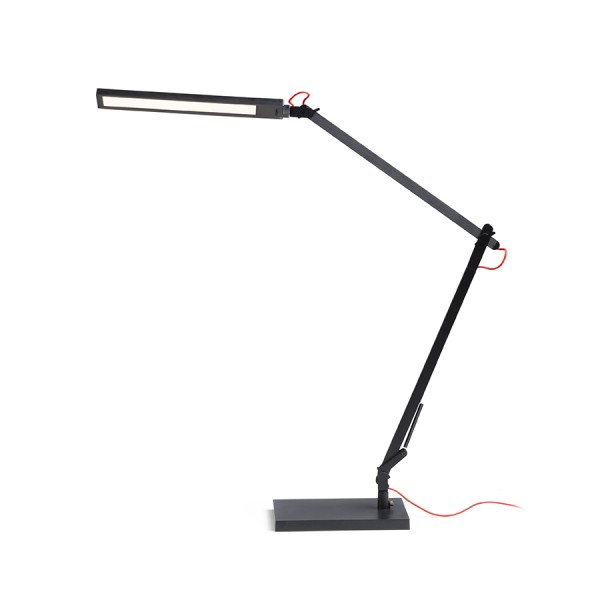 Delovna namizna svetilka z vgrajeno LED diodo, zglobno roko in zatemnilnim stikalom na vrhu reflektorja za tristopenjsko zatemnitev in nastavljivo barvno temperaturo. Svetilko lahko pritrdite na mizo ali polico z nakupom ločene EMA C-objemke (R14290, R14291).