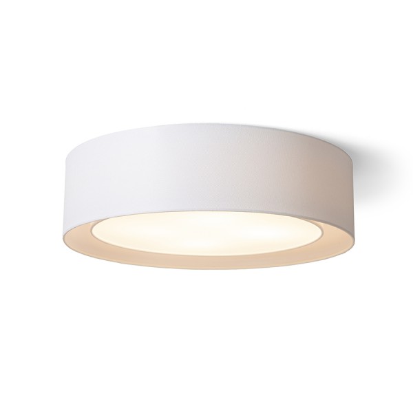 Okrogla stropna svetilka z dvojnim tekstilnim senčnikom in tremi vtičnicami E27. Notranji odtenek je v beli barvi.