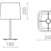 Namizna svetilka s kotnim tekstilnim senčilom in kovinsko podlago.