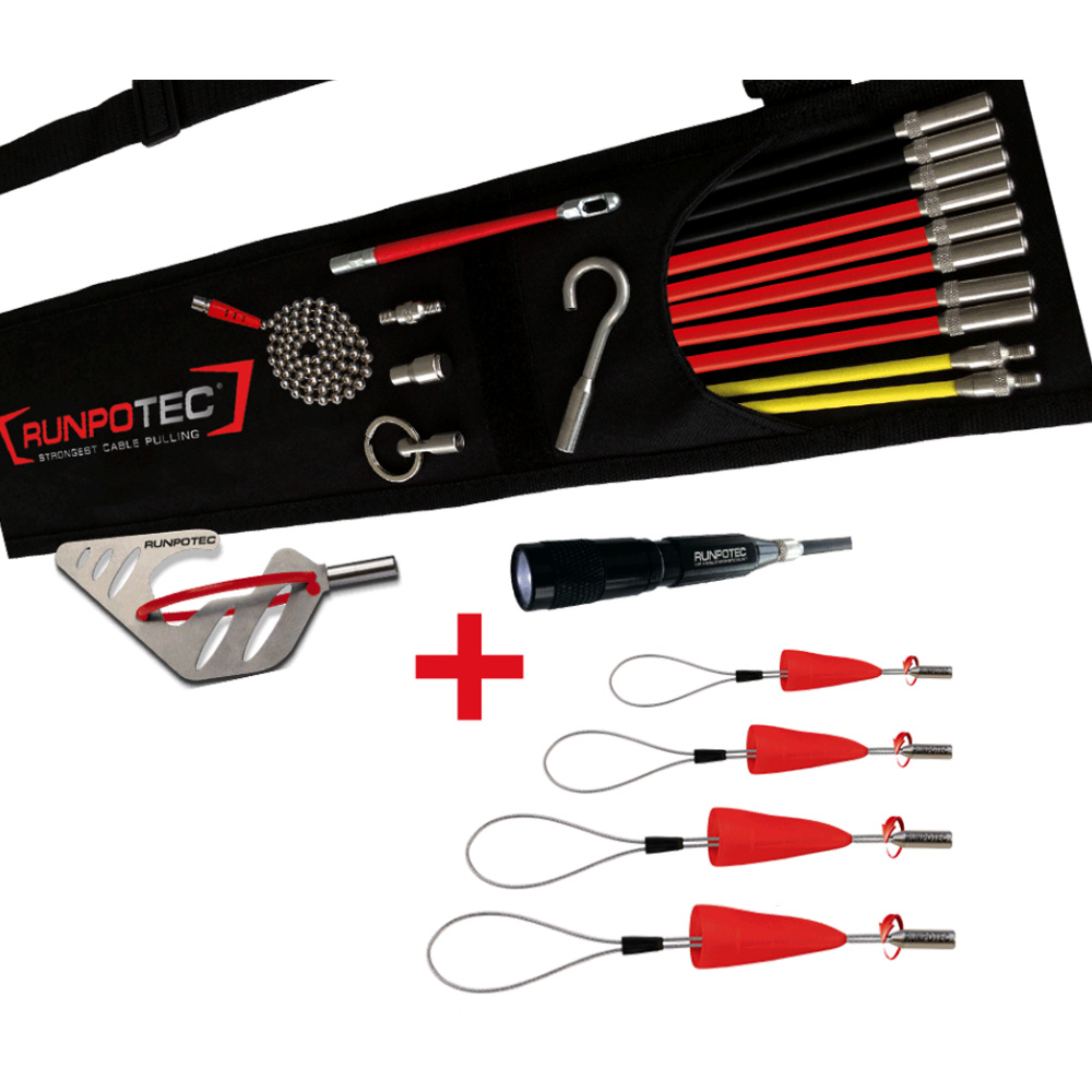Set vsebuje (19 kos) – 10 palic Runposticks 5×1 m rdeči (trdi) fi 7,5 mm, 3×1 m črni (srednji) fi 5,5 mm, 2×1 m rumeni (mehki) fi 4,5 mm, vodilno glavo Runpoglider, izjemno močan magnet, kroglično verigo, nastavek očesni, kavelj, povezovalni spoj, torbo za shranjevanje + led svetilko + drsno kljuko + nastavke za vleko kablov z zanko in kavljem (4 kos). Led svetilka je odporna proti udarcem. Vsi dodatki RUNPOTEC imajo navoj RTG fi 6 mm.