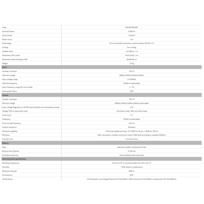 EVO DSP PLUS 3.600 – Moč 3.600 VA PF 0,9. DSP “On Line” tehnologija (VFI), učinkovitost 94 %, vhod/izhod 230/230Vac 50/60Hz, dimenzije 19×31,8×42,1 cm, teža 27 kg, avtonomija 10 min, vsebuje 6 baterij 12Vdc 9Ah, samodejni bypass. Povezovalnik za priključitev dodatne Box Battery, USB in RS232 komunikacijska vrata za nadzor UPS-a in programiranje vklopa/izklopa z uporabo brezplačne programske opreme TecnoManager. Kartica SNMP, MODBUS ali s suhimi kontakti (opcijsko).
