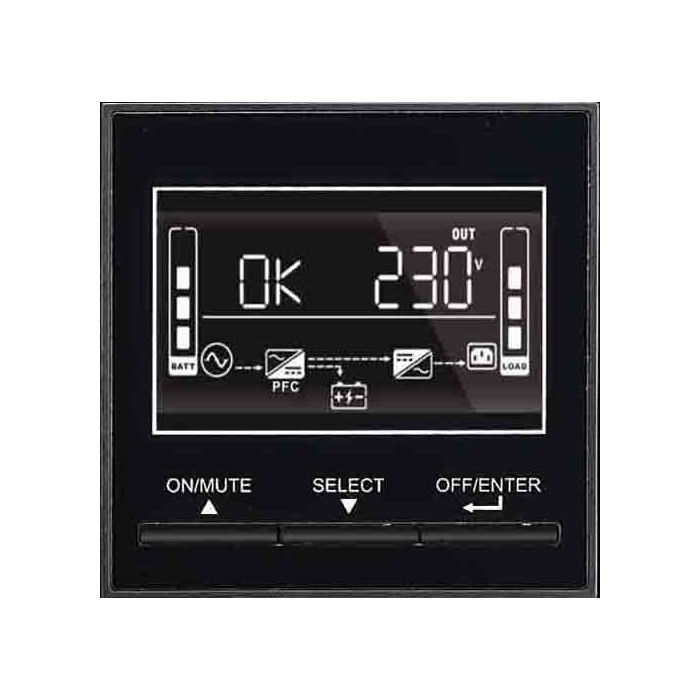 Zasnovan je tudi z mislijo na enostavno upravljanje, saj ima vgrajen LCD zaslon, ki prikazuje pomembne informacije, kot so status napajanja, preostanek časa delovanja na bateriji, obremenitev in druge uporabne parametre.